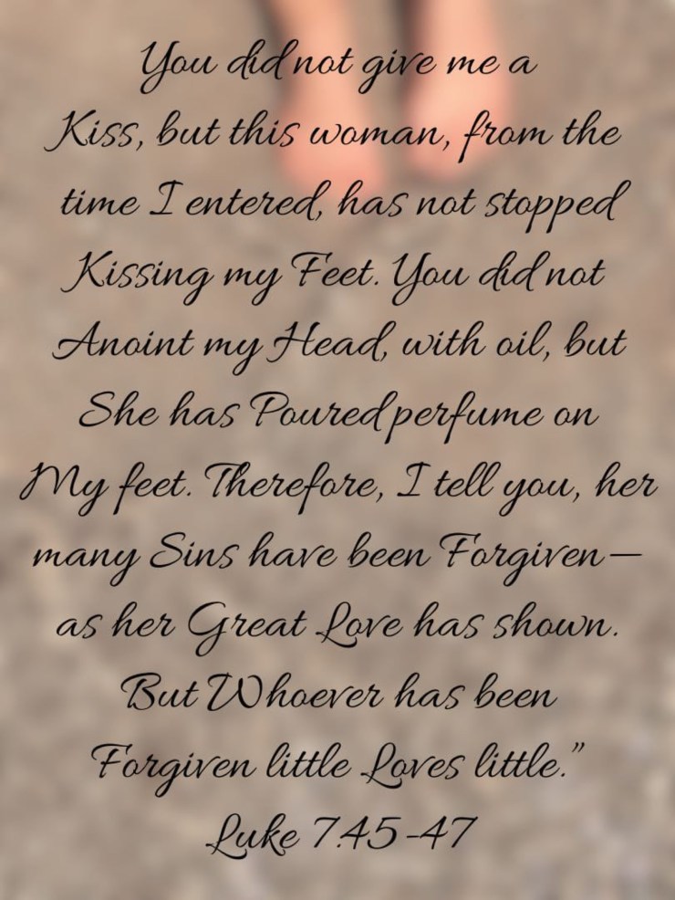 Then he turned toward the woman and said to Simon, “Do you see this woman? I came into your house. You did not give me any water for my feet, but she wet my feet with her tears and wiped them with her hair. You did not give me a kiss, but this woman, from the time I entered, has not stopped kissing my feet. You did not put oil on my head, but she has poured perfume on my feet. Therefore, I tell you, her many sins have been forgiven—as her great love has shown. But whoever has been forgiven little loves little.””